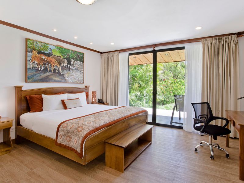 Alle Zimmer bieten eine eigene Terrasse mit Schaukelstühlen und Blick auf den Vulkan Arenal, umgeben vom tropischen Garten; ein Kingsize oder 2 Queensize-Betten, Klimaanlage, Deckenventilator, Kühlschrank gefüllt mit Softgetränken (gratis), Kaffeemaschine (Kaffee und Tee gratis), Telefon, Kabelfernsehen, kabelloses Internet, Zimmersafe sowie Privatbad mit Dusche und Haartrockner.