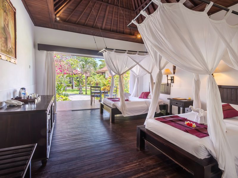 Die geräumigen Zimmer sind mit kunstvoll geschnitzten Holzmöbeln ausgestattet und bieten Annehmlichkeiten wie Klimaanlage, Flachbild-TV, kostenfreies WLAN und einen gemütlichen Sitzbereich. Ihr eigenes Bad verfügt über eine Dusche oder Badewanne sowie hochwertige Pflegeprodukte. Genießen Sie den Blick auf den gepflegten Garten von Ihrem privaten Balkon aus.