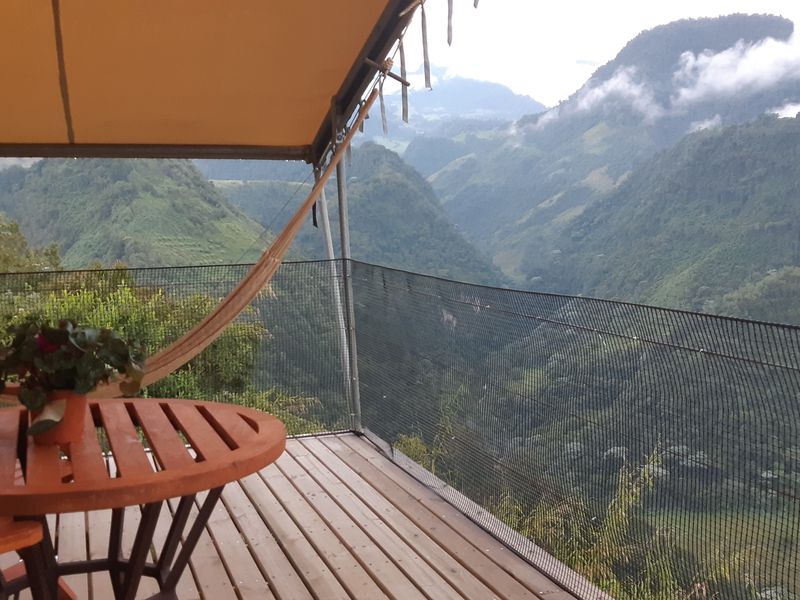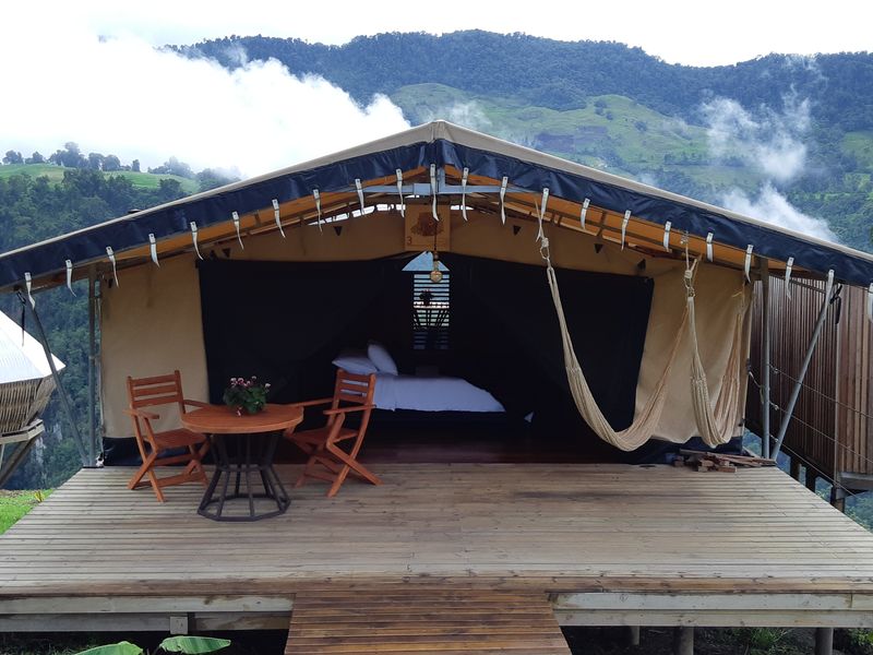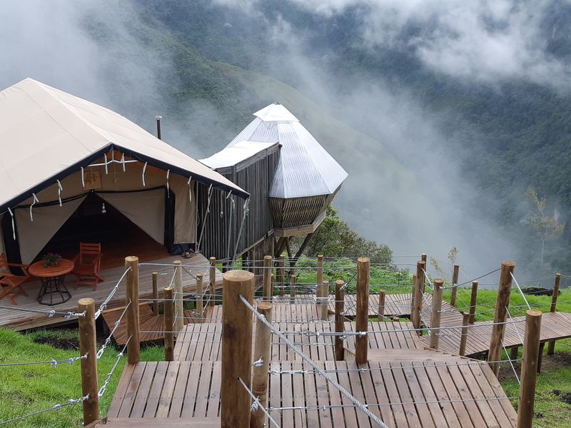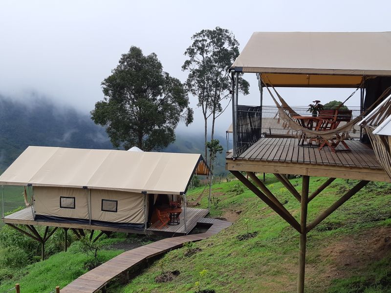 Das Nido del Cóndor liegt auf einem Hochplateau, das sich wie eine Insel zwischen zwei Schluchten inmitten der Andenlandschaft erhebt. Es ist eine Ecolodge in einem luxuriösen Glamping Stil umgeben von Ruhe und Natur. Die 5 Zelte sind luxuriös ausgestattet, jedes mit einem Ofen, Warmwasser, Ferngläsern, Loungesesseln, Hängematten auf der Terrasse und vielen weiteren Annehmlichkeiten, um an diesem herrlichen Ort zu entspannen. Von der Terrasse des Restaurants aus sowie von den 2 Terrassen jedes Zeltes kann man nicht nur den Blick auf den majestätischen Nevado del Ruiz genießen, sondern auch das Kondor Paar beobachten, das in den Felsen des Plateaus nistet. Verschiedene angelegte Wege laden dazu ein, die herrliche Landschaft und die Vegetation zu Fuß zu genießen. Das Restaurant erfreut den Gaumen mit Genüssen der Region kombiniert mit einem Hauch des Geschmacks der Pazifikküste. Ein perfekter Ort zum Abschalten.